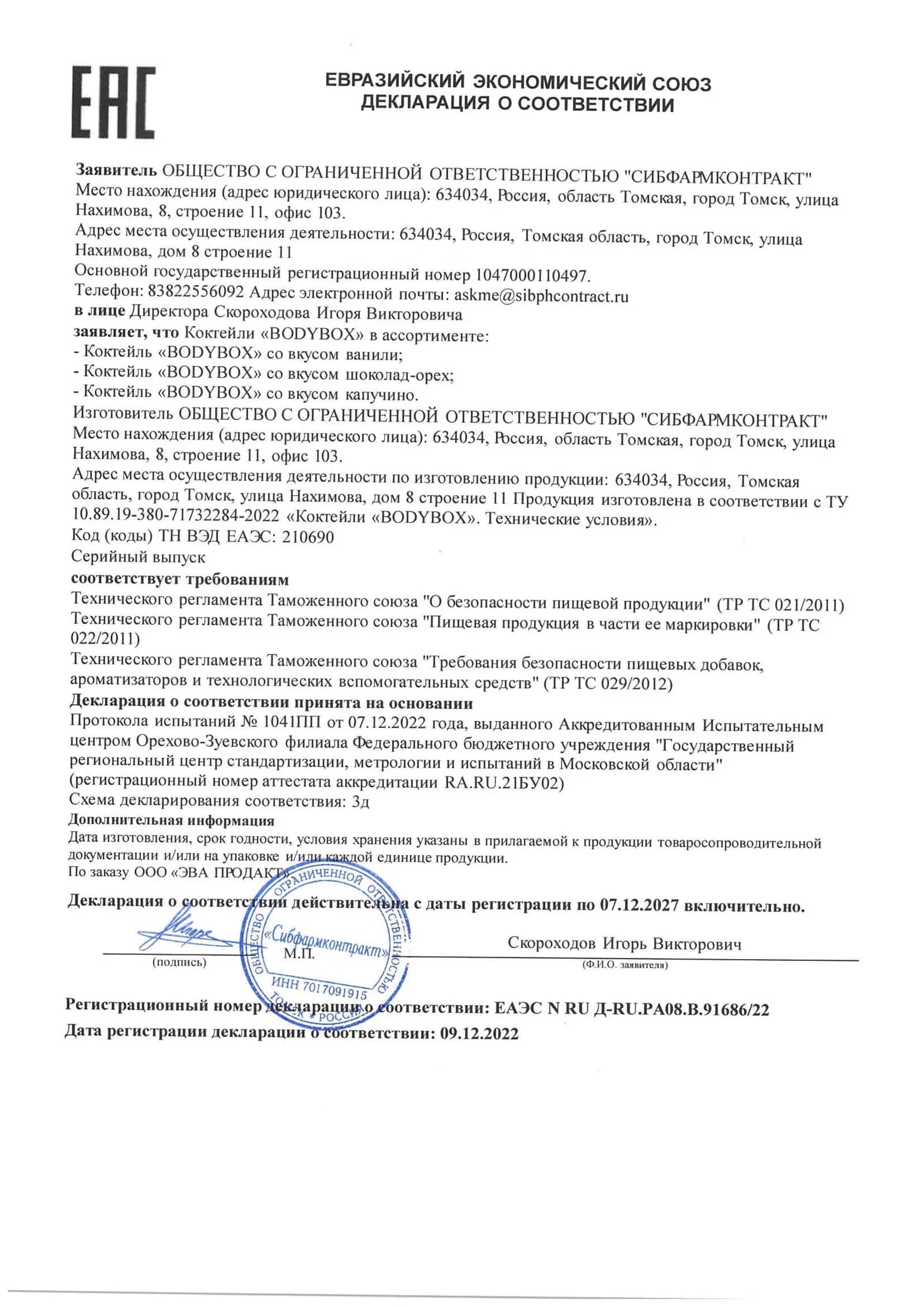 | Энергетическая ценность одной порции (33 г), / кДж/ккал | 854/204 | |